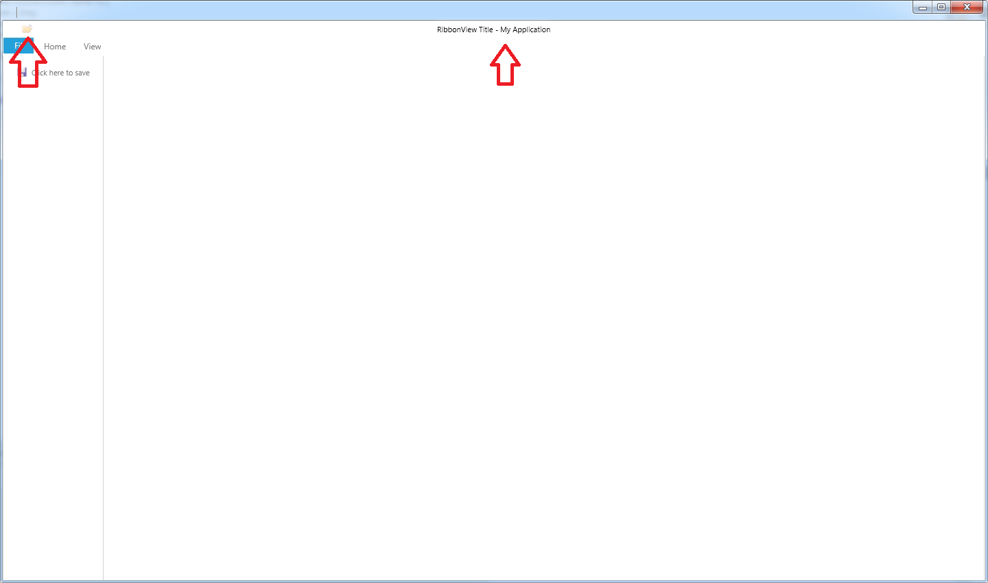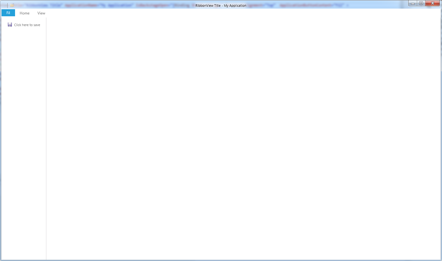 <telerik:RadRibbonWindow x:Class="TelerikRibbon.MainWindow" xmlns:telerik="clr-namespace:Telerik.Windows.Controls;assembly=Telerik.Windows.Controls.RibbonView" xmlns:controls="clr-namespace:Telerik.Windows.Controls;assembly=Telerik.Windows.Controls.Navigation" Title="Window title should not be displayed"> <Grid> <telerik:RadRibbonView Title="RibbonView Title" ApplicationName="My Application" IsBackstageOpen="{Binding ShowBackStage}" CollapseThresholdSize="100,100" VerticalAlignment="Top" ApplicationButtonContent="Fil" > <telerik:RadRibbonView.QuickAccessToolBar> <telerik:QuickAccessToolBar CustomizationMenuVisibility="Collapsed"> <telerik:RadRibbonButton Text="Open" SmallImage="/Images/Icons/open.png" Size="Small" /> </telerik:QuickAccessToolBar> </telerik:RadRibbonView.QuickAccessToolBar> <!-- Backstage section--> <telerik:RadRibbonView.Backstage> <telerik:RadRibbonBackstage> <!-- Save--> <telerik:RadRibbonBackstageItem Header="Click here to save" Icon="/Images/Icons/save.png" CloseOnClick="True" IsSelectable="true" /> </telerik:RadRibbonBackstage> </telerik:RadRibbonView.Backstage> <telerik:RadRibbonTab Header="Home"> <telerik:RadRibbonGroup Header="Clipboard"> <telerik:RadRibbonSplitButton Size="Large" Text="Paste" telerik:ScreenTip.Description="Paste the contents the Clipboard." telerik:ScreenTip.Title="Paste(Ctrl+V)"> <telerik:RadRibbonSplitButton.DropDownContent> <controls:RadContextMenu BorderThickness="0"> <controls:RadMenuItem Header="Paste" /> <controls:RadMenuItem Header="Paste Form" /> </controls:RadContextMenu> </telerik:RadRibbonSplitButton.DropDownContent> </telerik:RadRibbonSplitButton> </telerik:RadRibbonGroup> </telerik:RadRibbonTab> <telerik:RadRibbonTab Header="View" /> </telerik:RadRibbonView> </Grid></telerik:RadRibbonWindow>