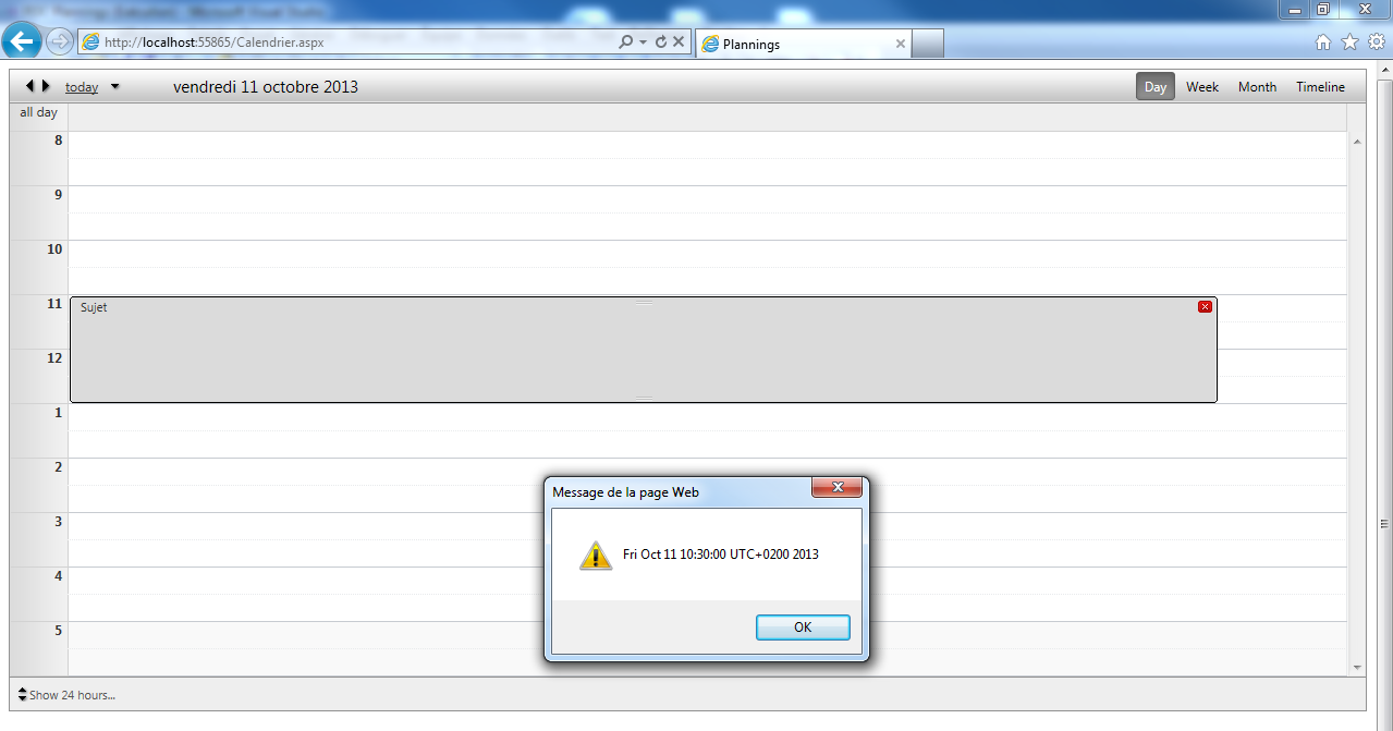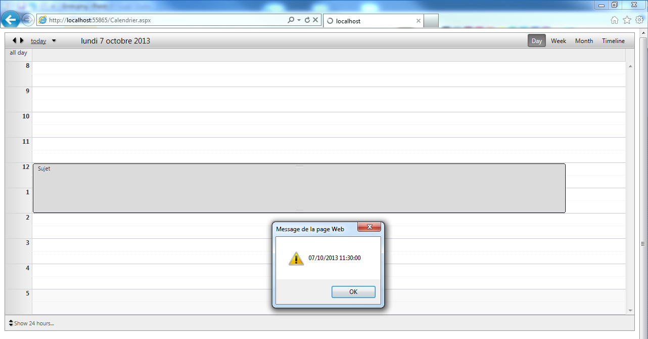<telerik:RadScriptBlock runat="server"> <script type="text/javascript"> function onAppointmentMoveEnd(sender, args) { alert(args.get_newStartTime()); } </script> </telerik:RadScriptBlock> <div> <telerik:RadScheduler OnClientAppointmentMoveEnd="onAppointmentMoveEnd" runat="server" ID="schPlanning" DataKeyField="Libelle" DataSubjectField="SujetEvenement" DataDescriptionField="Libelle" DataStartField="Debut" DataEndField="Fin" Height="1000px"> </telerik:RadScheduler> </div>public partial class Calendrier : Page{ private void schPlanning_AppointmentUpdate(object sender, AppointmentUpdateEventArgs e) { DateTime newStartTime = e.ModifiedAppointment.Start; // Alert(newStartTime) } protected override void OnInit(EventArgs e) { base.OnInit(e); schPlanning.AppointmentUpdate += new AppointmentUpdateEventHandler(schPlanning_AppointmentUpdate); } protected void Page_Load(object sender, EventArgs e) { if (!IsPostBack) { List<Evenement> evenements = new List<Evenement>(); evenements.Add(new Evenement("Sujet", "Libelle", DateTime.Now.Date.AddHours(15), DateTime.Now.Date.AddHours(17))); schPlanning.DataSource = evenements; } }}public class Evenement{ public string SujetEvenement { get; set; } public string Libelle { get; set; } public DateTime Debut { get; set; } public DateTime Fin { get; set; } public Evenement(string sujetEvenement, string libelle, DateTime debut, DateTime fin) { SujetEvenement = sujetEvenement; Libelle = libelle; Debut = debut; Fin = fin; }}I join a screenshot when I have the error.