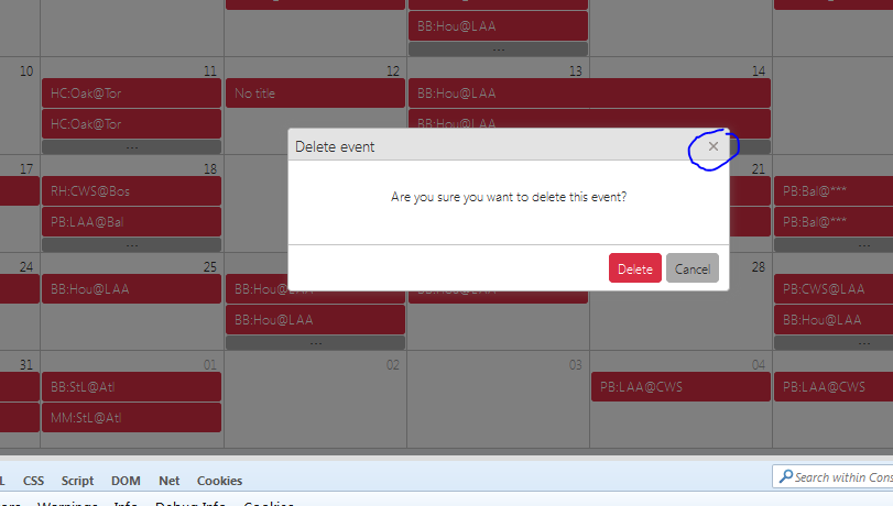 When i have opened the delete popup of event and after it when i am clicking the X-button as per highlighted area in attached screen then pop is not getting closed.