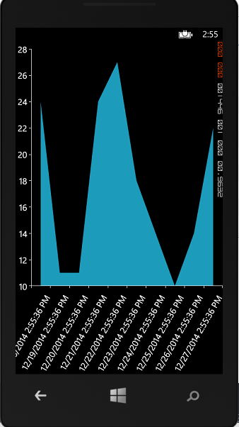 01.using System;02.using System.Collections.Generic;03.using System.Linq;04.using System.Text;05.using System.Threading.Tasks;06.using Telerik.XamarinForms.Chart;07.using TelerikTests.ViewModel;08.using Xamarin.Forms;09. 10.namespace TelerikTests.View11.{12. public class ChartViewModel13. {14. private static Random random = new Random();15. 16. 17. public ChartViewModel()18. {19. this.Data = GetDateTimeData(10);20. }21. 22. public List<TemporalData> Data { get; set; }23. 24. public string Title { get; set; }25. public static List<TemporalData> GetDateTimeData(int itemsCount)26. {27. var startDate = DateTime.Now.AddYears(-1);28. 29. var items = new List<TemporalData>();30. for (int i = 0; i < itemsCount; i++)31. {32. var data = new TemporalData();33. data.Category = startDate.AddDays(i);34. data.Value = random.Next(10, 30);35. 36. items.Add(data);37. }38. 39. return items;40. }41. }42. public class ChartPage :43. ContentPage44. {45. public ChartPage()46. {47. this.BindingContext = new ChartViewModel() { Title="test"};48. this.BackgroundColor = Device.OnPlatform49. (50. Color.White, Color.White, Color.Transparent51. );52. var chart=CreateChart();53. chart.HeightRequest = 300;54. this.Content = chart;55. }56. 57. private static RadCartesianChart CreateChart()58. {59. var chart = new RadCartesianChart60. {61. HorizontalAxis = new Telerik.XamarinForms.Chart.DateTimeContinuousAxis() { 62. GapLength = 0.5, 63. MajorStep=1,64. MajorStepUnit = TimeInterval.Day,65. LabelFitMode = AxisLabelFitMode.Rotate,66. ShowLabels = true67. //PlotMode = AxisPlotMode.BetweenTicks68. },69. VerticalAxis = new Telerik.XamarinForms.Chart.NumericalAxis(),70. };71. 72. var series = CreateSeries();73. series.DisplayName = "TEst";74. 75. chart.Series.Add(series);76. return chart;77. }78. 79. private static AreaSeries CreateSeries()80. {81. var series = new Telerik.XamarinForms.Chart.AreaSeries();82. series.SetBinding(CategoricalSeries.ItemsSourceProperty, new Binding("Data"));83. 84. series.ValueBinding = new Telerik.XamarinForms.Chart.PropertyNameDataPointBinding85. {86. PropertyName = "Value"87. };88. 89. series.CategoryBinding = new Telerik.XamarinForms.Chart.PropertyNameDataPointBinding90. {91. PropertyName = "Category"92. };93. 94. return series;95. }96. }97.}
