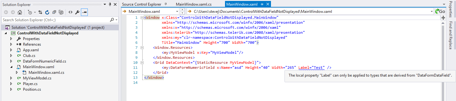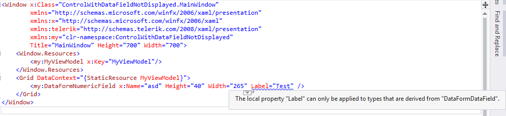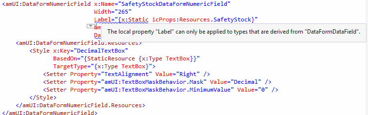 Although I am not using this control in a DataForm, it is definitely derived from DataFormDataField. As you can see I am getting an exception in the Xaml designer. It compiles fine and displays fine at runtime; however it prevents the Xaml UserControl from displaying in the designer. I get many, many of these errors. Can anyone give me a hand with this?
