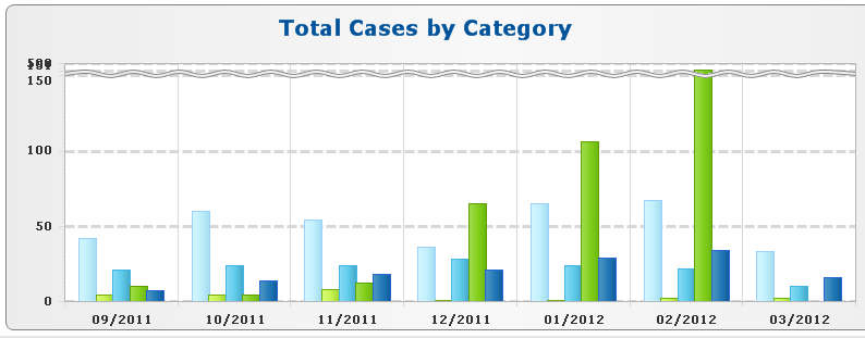 <telerik:RadChart ID="rcTotalCaseTypes" AutoLayout="true" runat="Server" Width="900px" Skin="Telerik" Style="margin: 0px auto;" IntelligentLabelsEnabled="True"> <Legend Visible="true"> <Appearance GroupNameFormat="#VALUE"> </Appearance> </Legend> <ChartTitle TextBlock-Text="Total Cases by Category"> <TextBlock> <Appearance TextProperties-Font="Verdana, 20px, style=Bold" TextProperties-Color="#00529B"> </Appearance> </TextBlock> </ChartTitle> <PlotArea> <Appearance Dimensions-Margins="18%, 22%, 12%, 14%"> </Appearance> <XAxis DataLabelsColumn="PrettyMonthYr"> <Appearance> <TextAppearance TextProperties-Font="Verdana, 8pt, style=Bold"> </TextAppearance> </Appearance> </XAxis> <YAxis LabelStep="5" ScaleBreaks-Enabled="true" AutoScale="False"> <Appearance ValueFormat="None"> <TextAppearance TextProperties-Font="Verdana, 8pt, style=Bold"> </TextAppearance> <MajorGridLines Width="3" PenStyle="Dash" /> <MinorGridLines Visible="false" /> </Appearance> </YAxis> </PlotArea> </telerik:RadChart>On the code behind (this code is executed on Page_Init):