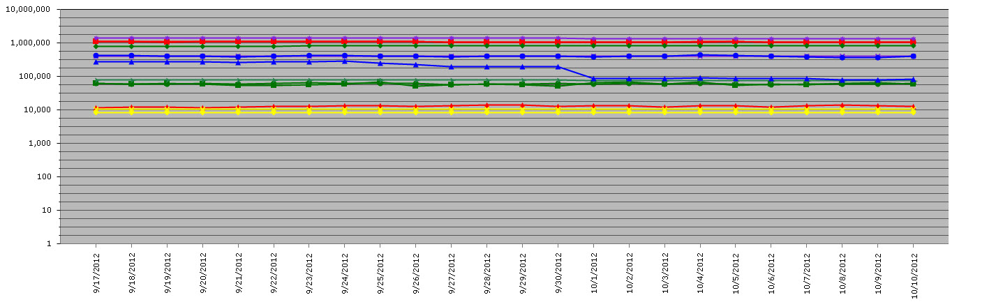 The chart displays a huge empty portion of the chart, between 1 and 10,000 on the Axis. There isn't even any data value below 10,000. Why is it plotting this empty area? It should start plotting near the bottom of the data lines, right?