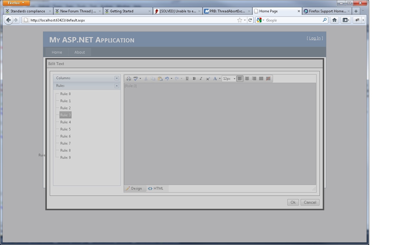 .TelerikModalOverlay{ z-index: 100000 !important;}This solved the issue in IE8, but the problem persists in FireFox. I have a sample application in .zip format ready to send, however I can not attach a .zip file.