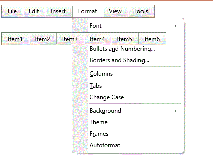 <telerik:RadMenu ID="RadMenu1" runat="server" EnableRoundedCorners="true" EnableShadows="true" EnableEmbeddedSkins="true" Skin="Default"> <Items> <telerik:RadMenuItem Text="File" AccessKey="F"> <Items> <telerik:RadMenuItem Text="New" AccessKey="w" /> <telerik:RadMenuItem Text="Open" AccessKey="O" /> <telerik:RadMenuItem IsSeparator="True" /> <telerik:RadMenuItem Text="Save" AccessKey="S" /> <telerik:RadMenuItem Text="Save As" AccessKey="A" /> <telerik:RadMenuItem IsSeparator="True" /> <telerik:RadMenuItem Text="Print Preview" AccessKey="V" /> <telerik:RadMenuItem Text="Print" AccessKey="P" /> <telerik:RadMenuItem IsSeparator="True" /> <telerik:RadMenuItem Text="Close" AccessKey="C" /> </Items> </telerik:RadMenuItem> <telerik:RadMenuItem Text="Edit" AccessKey="E"> <Items> <telerik:RadMenuItem Text="Undo" AccessKey="U" /> <telerik:RadMenuItem IsSeparator="True" /> <telerik:RadMenuItem Text="Cut" AccessKey="T" /> <telerik:RadMenuItem Text="Copy" AccessKey="C" /> <telerik:RadMenuItem Text="Paste" AccessKey="P" /> <telerik:RadMenuItem Text="Clipboard..." AccessKey="b" /> <telerik:RadMenuItem IsSeparator="True" /> </Items> </telerik:RadMenuItem> <telerik:RadMenuItem Text="Insert" AccessKey="I"> <Items> <telerik:RadMenuItem Text="Break..." AccessKey="B" /> <telerik:RadMenuItem Text="Page Numbers..." AccessKey="U" /> <telerik:RadMenuItem Text="Date and Time..." AccessKey="T" /> <telerik:RadMenuItem Text="Field..." AccessKey="F" /> <telerik:RadMenuItem Text="Symbol..." AccessKey="S" /> <telerik:RadMenuItem Text="Comment" AccessKey="M" /> <telerik:RadMenuItem IsSeparator="True" /> <telerik:RadMenuItem Text="Picture" AccessKey="P" /> <telerik:RadMenuItem Text="Diagram" AccessKey="G" /> <telerik:RadMenuItem Text="Text Box" AccessKey="X" /> <telerik:RadMenuItem Text="Hyperlink" AccessKey="I" /> </Items> </telerik:RadMenuItem> <telerik:RadMenuItem Text="Format" AccessKey="O"> <Items> <telerik:RadMenuItem Text="Font" GroupSettings-Height="200"> <Items> <telerik:RadMenuItem Text="Arial" /> <telerik:RadMenuItem Text="Verdana" /> <telerik:RadMenuItem Text="Tahoma" /> <telerik:RadMenuItem Text="Sans-serif" /> <telerik:RadMenuItem IsSeparator="true" /> <telerik:RadMenuItem Text="Arial" /> <telerik:RadMenuItem Text="Arial Black" /> <telerik:RadMenuItem Text="Arial Narrow" /> <telerik:RadMenuItem Text="Arial Unicode MS" /> <telerik:RadMenuItem Text="Bookman Old Style" /> <telerik:RadMenuItem Text="Bookshelf Symbol 7" /> <telerik:RadMenuItem Text="Century" /> <telerik:RadMenuItem Text="Century Gothic" /> <telerik:RadMenuItem Text="Comic Sans MS" /> <telerik:RadMenuItem Text="Courier New" /> <telerik:RadMenuItem Text="Garamond" /> <telerik:RadMenuItem Text="Georgia" /> <telerik:RadMenuItem Text="Goudy Old Style" /> <telerik:RadMenuItem Text="Goudy Stout" /> <telerik:RadMenuItem Text="Haettenschweiler" /> <telerik:RadMenuItem Text="Helvetica" /> <telerik:RadMenuItem Text="Impact" /> <telerik:RadMenuItem Text="Imprint MT Shadow" /> <telerik:RadMenuItem Text="Latha" /> <telerik:RadMenuItem Text="Lucida Console" /> <telerik:RadMenuItem Text="Lucida Sans" /> <telerik:RadMenuItem Text="Lucida Sans Typewriter" /> <telerik:RadMenuItem Text="Lucida Sans Unicode" /> </Items> </telerik:RadMenuItem> <telerik:RadMenuItem Text="Paragraph..." AccessKey="P" /> <telerik:RadMenuItem Text="Bullets and Numbering..." AccessKey="N" /> <telerik:RadMenuItem Text="Borders and Shading..." AccessKey="B" /> <telerik:RadMenuItem IsSeparator="true" /> <telerik:RadMenuItem Text="Columns" AccessKey="C" /> <telerik:RadMenuItem Text="Tabs" AccessKey="T" /> <telerik:RadMenuItem Text="Change Case" AccessKey="E" /> <telerik:RadMenuItem IsSeparator="true" /> <telerik:RadMenuItem Text="Background" AccessKey="g"> <Items> <telerik:RadMenuItem> <ItemTemplate> <div style="padding: 20px 0 20px 20px;"> <telerik:RadColorPicker runat="server" ID="RadColorPicker1" Preset="Metro" ShowEmptyColor="false" Width="200px" SelectedColor="#000000" /> </div> </ItemTemplate> </telerik:RadMenuItem> <telerik:RadMenuItem IsSeparator="True" /> <telerik:RadMenuItem Text="More Colors..." AccessKey="M" /> <telerik:RadMenuItem Text="Fill Efects..." AccessKey="F" /> <telerik:RadMenuItem Text="Printed Watermark..." AccessKey="W" /> </Items> </telerik:RadMenuItem> <telerik:RadMenuItem Text="Theme" AccessKey="H" /> <telerik:RadMenuItem Text="Frames" AccessKey="R" /> <telerik:RadMenuItem Text="Autoformat" AccessKey="A" /> </Items> </telerik:RadMenuItem> <telerik:RadMenuItem Text="View" AccessKey="V"> <Items> <telerik:RadMenuItem Text="Normal" AccessKey="N" /> <telerik:RadMenuItem Text="Web Layout" AccessKey="W" /> <telerik:RadMenuItem Text="Print Layout" AccessKey="P" /> <telerik:RadMenuItem IsSeparator="True" /> <telerik:RadMenuItem Text="Task Pane" AccessKey="p" /> </Items> </telerik:RadMenuItem> <telerik:RadMenuItem Text="Tools" AccessKey="T"> <Items> <telerik:RadMenuItem Text="Spelling And Grammar..." AccessKey="S" /> <telerik:RadMenuItem Text="Research..." AccessKey="R" /> <telerik:RadMenuItem Text="Language" AccessKey="L" /> <telerik:RadMenuItem Text="Word Count..." AccessKey="W" /> <telerik:RadMenuItem IsSeparator="True" /> <telerik:RadMenuItem Text="Track Changes" AccessKey="T" /> <telerik:RadMenuItem Text="Compare And Merge Documents.." AccessKey="D" /> </Items> </telerik:RadMenuItem> </Items></telerik:RadMenu><br /><br /><br /><telerik:RadMenu ID="RadMenu2" runat="server" EnableRoundedCorners="true" EnableShadows="true" EnableEmbeddedSkins="true" Skin="Default"> <Items> <telerik:RadMenuItem Text="Item1" AccessKey="1"> </telerik:RadMenuItem> <telerik:RadMenuItem Text="Item2" AccessKey="2"> </telerik:RadMenuItem> <telerik:RadMenuItem Text="Item3" AccessKey="3"> </telerik:RadMenuItem> <telerik:RadMenuItem Text="Item4" AccessKey="4"> </telerik:RadMenuItem> <telerik:RadMenuItem Text="Item5" AccessKey="5"> </telerik:RadMenuItem> <telerik:RadMenuItem Text="Item6" AccessKey="6"> </telerik:RadMenuItem> </Items></telerik:RadMenu>