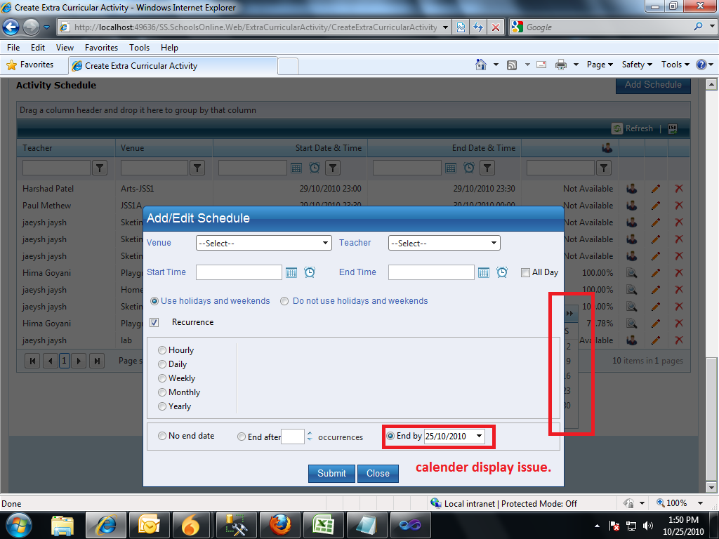 <cc1:ModalPopupExtender ID="mpAddSchedule" runat="server"PopupControlID="pnlAddScheduleContainer" TargetControlID="lnkAddSchedule" CancelControlID="btnMpClose" /> <asp:Panel ID="pnlAddScheduleContainer" runat="server" Style="display: none;"><telerik:RadSchedulerRecurrenceEditor runat="server" ID="radRecurrenceEditor"> </telerik:RadSchedulerRecurrenceEditor></Panel>this is my code.