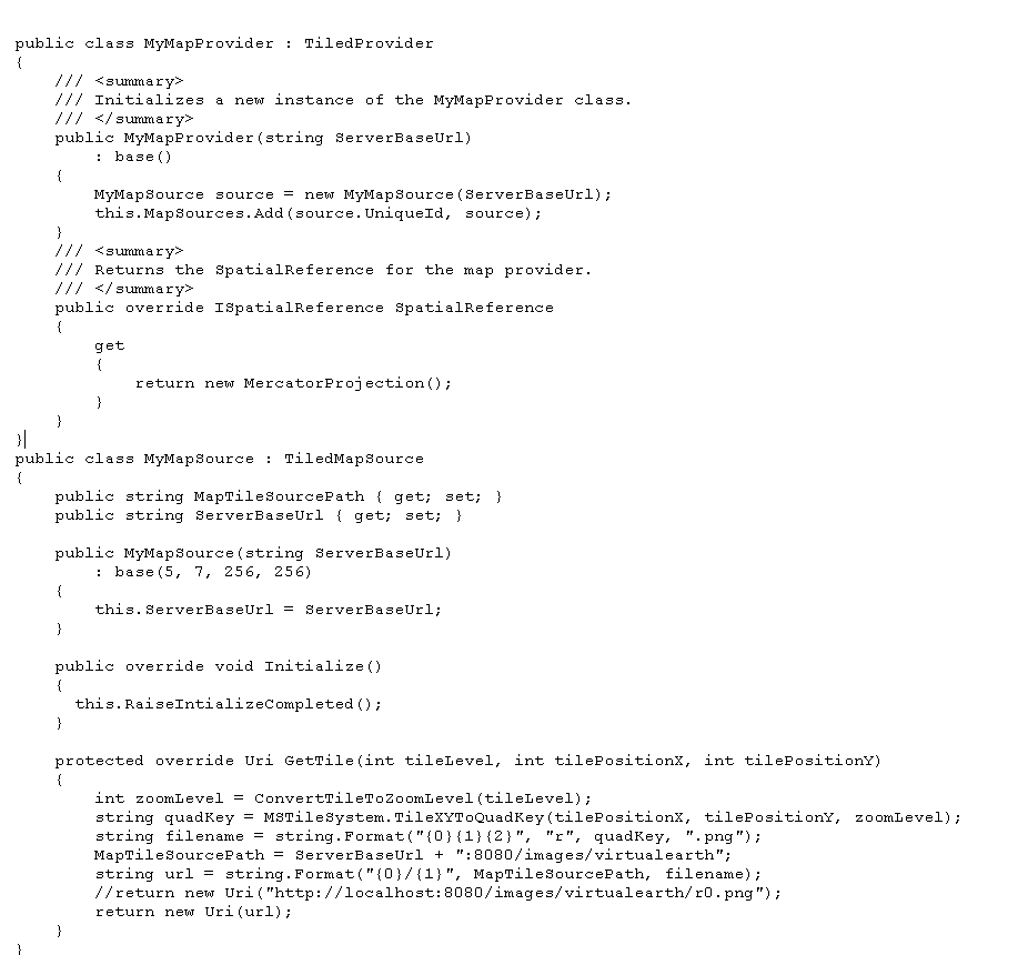 I did try setting those properties, but no luck. Couldn't get the map to Zoom in or change its Center. Please have a look at the code below and let me know where am I going wrong. Am using my own custom MapProvider, am not sure if that has to do anything with it. Am attaching my MapProvider code, just in case.