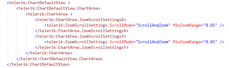 Hello, I implemented the ZoomAndScrollSettings declaratively in my RadChart using XAML (You can see the code snippet in the attached file). The problem is that the Scrollbar to scroll or to zoom isn't displayed in the diagram. Have I forgotten something or did I do something wrong?