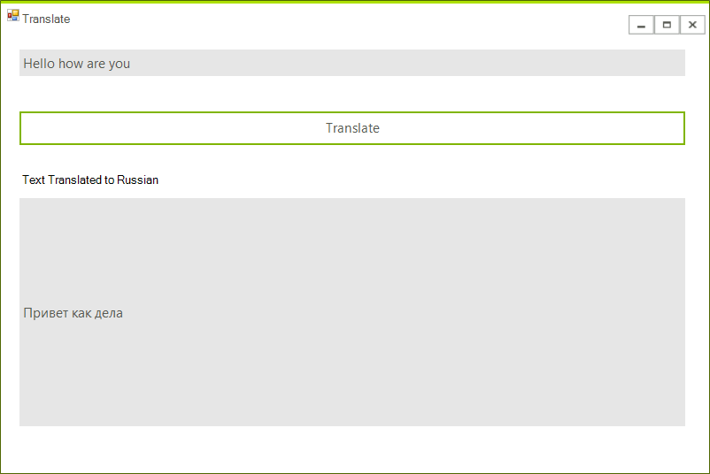 The typed message will be translated on a click of a RadButton. The following snippet shows how to access the translation API and translate the specific text: