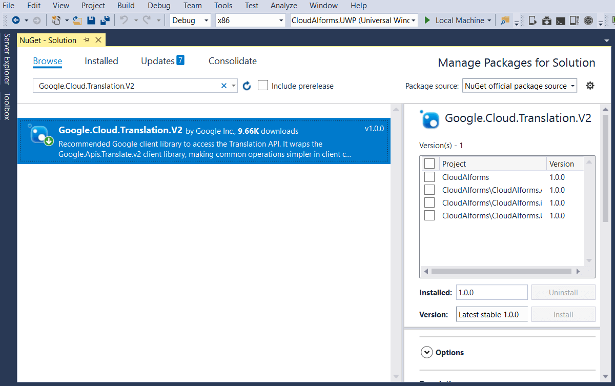 Once you have done so, you can add the Google.Cloud.Translation.V2 NuGet package to your application as shown in the image below: