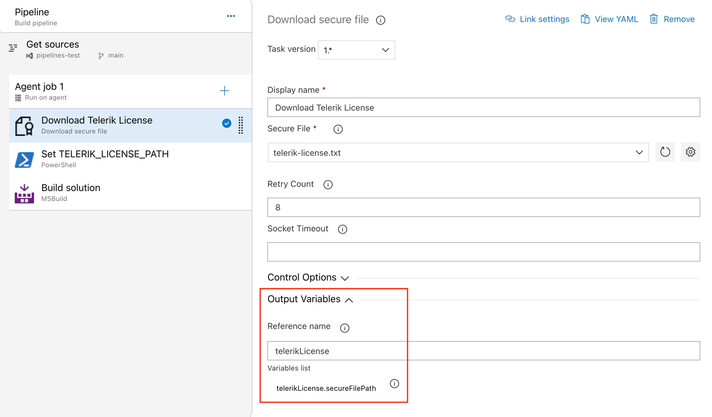 For a walkthrough example and more details, see DevOps Examples - Telerik License with Secure File in Classic Pipeline