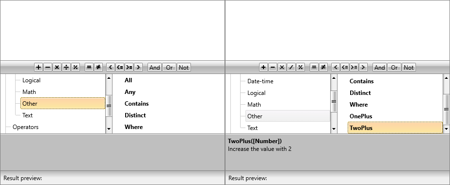 Example 6 adds the two custom functions defined in Example 4 to the Other subcategory. The results before and after respectively are illustrated in Figure 2.