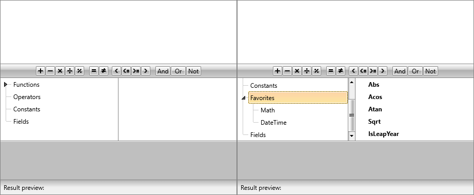 The example above removes some of the operators, constants and the Discontinued field from the RadExpressionEditor. It also creates a subcategory for the Fields category which holds the Car field of the bound object.