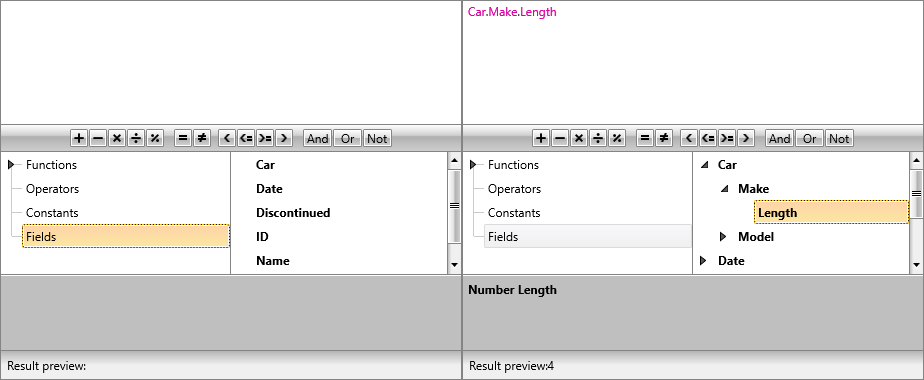 this.radExpressionEditor.IsFieldsDrillDownEnabled = true;Figure 1 illustrates the difference between the functionality being disabled and enabled.