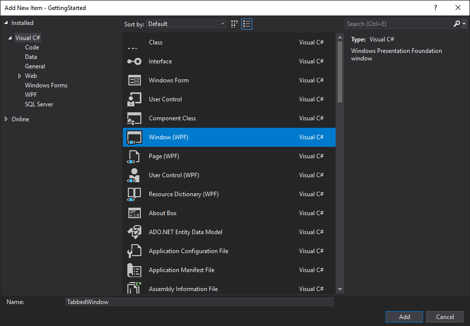 <telerik:RadTabbedWindow x:Class="GettingStarted.TabbedWindow"