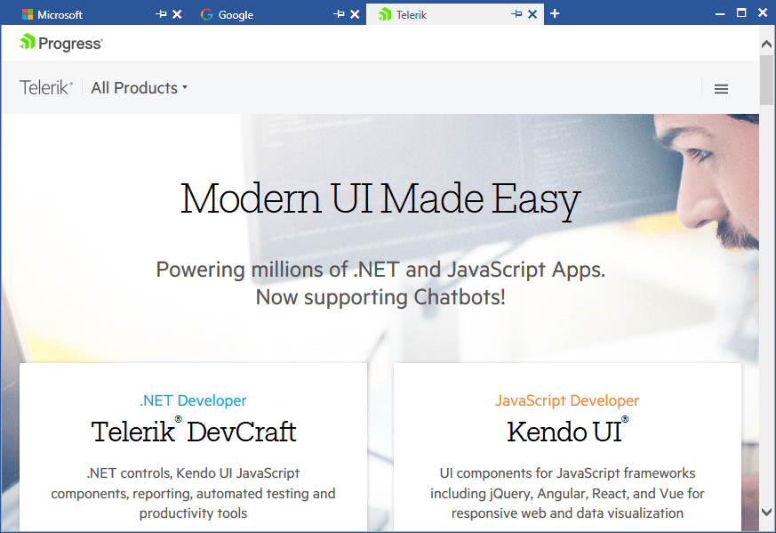 The RadTabbedWindow enables you to create browser-like interface which hosts its tabs in the title bar. The control also allows you to pin the tabs or reorder them via drag drop. Last but not least, RadTabbedWindow's functionality and appearance can be easily customized through its rich API.