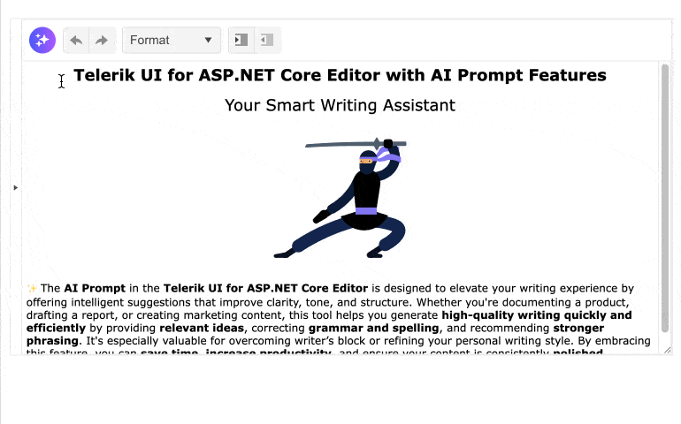 The Telerik UI for ASP.NET Core Editor now integrates with the InlineAIPrompt, a built-in AI component that lets users interact with AI tools directly while editing content.