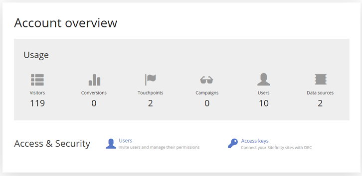 Digital Experience Cloud changed the way you connect your sites with DEC. To secure the connection between Sitefinity CMS and data centers, DEC now uses access keys as the authentication mechanism. Each access key is a JSON Web token which uniquely identifies each connection to Sitefinity CMS, or any specific site or instance. An access key is perpetually valid, however, an admin can deactivate it manually. Thus, you no longer need to enter user credentials when configuring the DEC connector settings. Learn more...