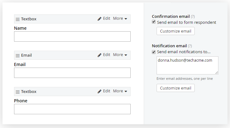 In addition to sending email notifications to a list of subscribers when someone submits a form response, you can now also send confirmation emails to the respondents upon successful form submission. You can also customize the content of the email messages sent to subscribers and respondents. You can insert all form fields as dynamic data in the email subject or body. Learn more...