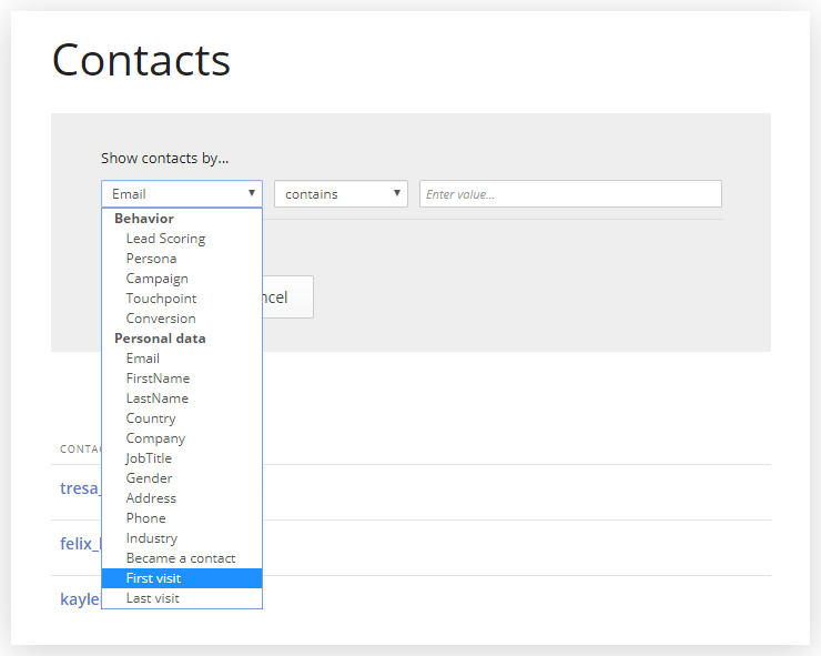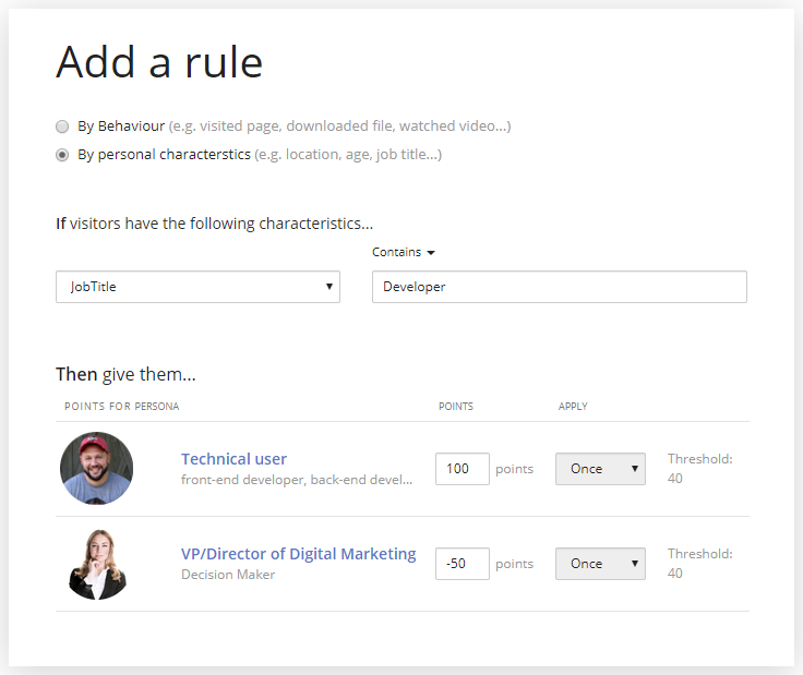 To make audience segmentation more multi-dimensional, in addition to persona scoring rules based on visitor behavior, you can now define rules based on any defined or automatically detected contact profile property and its string value. To define personalization segments with greater accuracy, you can also create rules with a combination of contact properties. Personalizing your visitors’ experiences based on such criteria helps you account for personal characteristics, demographics, or even specific marketing campaigns. Learn more...