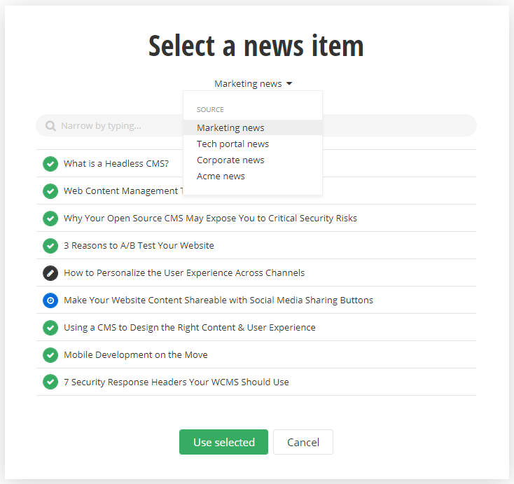 As of this release, content editors, working with the new content editing experience, can create related media or related data items on the go from the related data selector. When adding related content, they can either select an item from a list with existing content or create a new item of the same type. By default, the new item is stored in the Default source for this site. Learn more…